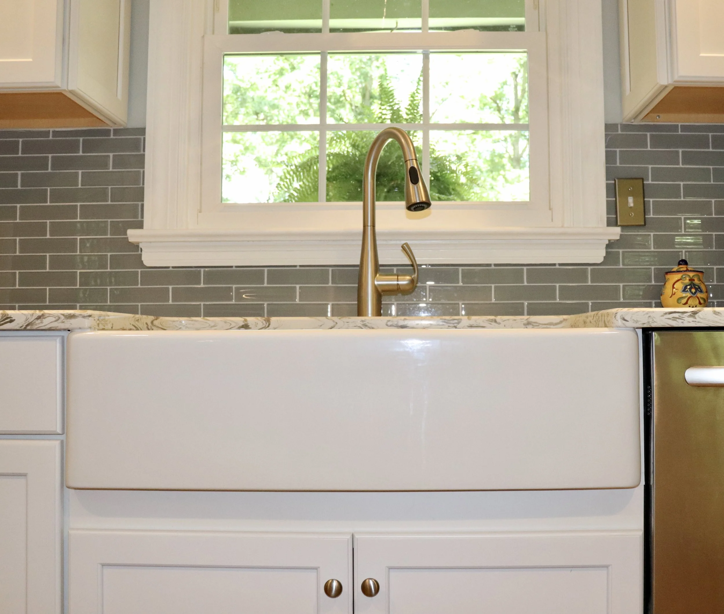 New cabinets, farm sink, granite counter tops, and tile backsplash